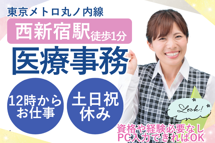 【西新宿駅徒歩1分】未経験OK×土日祝休み♪12時以降出勤!綺麗なクリニックで医療事務デビューしませんか?