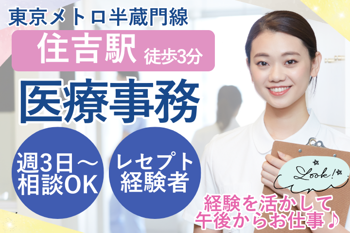 【住吉駅徒歩5分】週3日~OK*午後のみ短時間◆心療内科クリニックで医療事務募集/土日祝休み・扶養内勤務も相談可