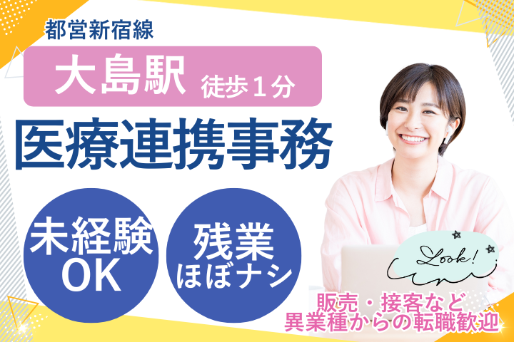 【大島駅徒歩1分】駅近でアクセス良好!落ち着いた雰囲気の下町で信頼される総合病院で事務のお仕事です!お子さんの進学や自立などでこの秋から未経験でも本格的にお仕事スタートしたい40代の方におすすめします