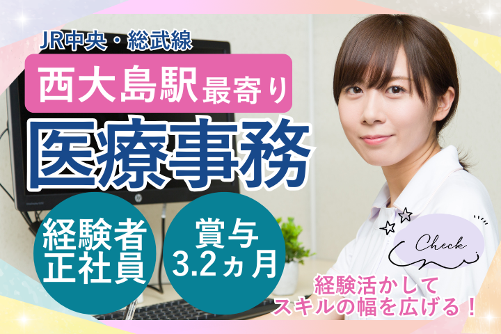 【西大島駅10分/正社員】経験者歓迎*資格不問/産休育休実績あり&賞与3.2ヶ月★子育て世代も安心の病院事務