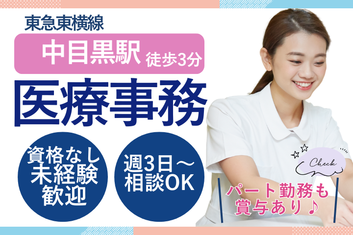 【中目黒駅徒歩3分】未経験OK!ブランク歓迎*クリニックの事務パート募集/週3日~シフト相談◎賞与あり