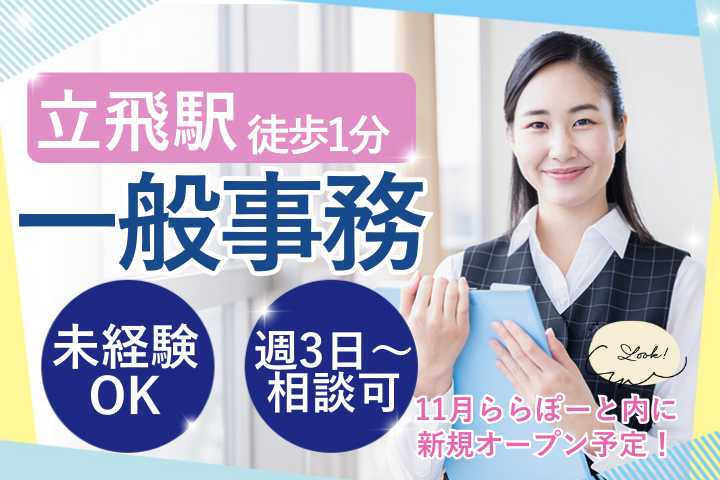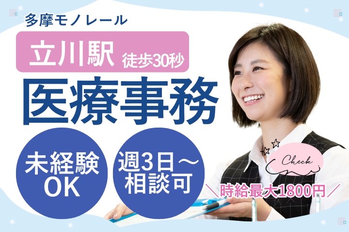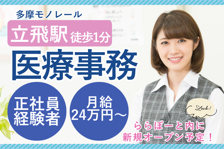 【立飛駅徒歩1分】オープニング正社員募集♪賞与あり&残業少なめ◎アクセス便利なクリニックで医療事務!