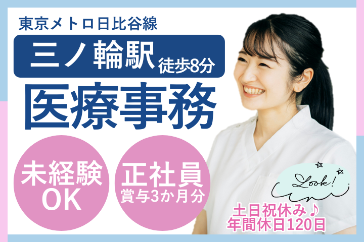 【三ノ輪駅】未経験OK!土日祝休み&年間休日120日★医療事務スタッフ募集/正社員・賞与3ヶ月支給◎
