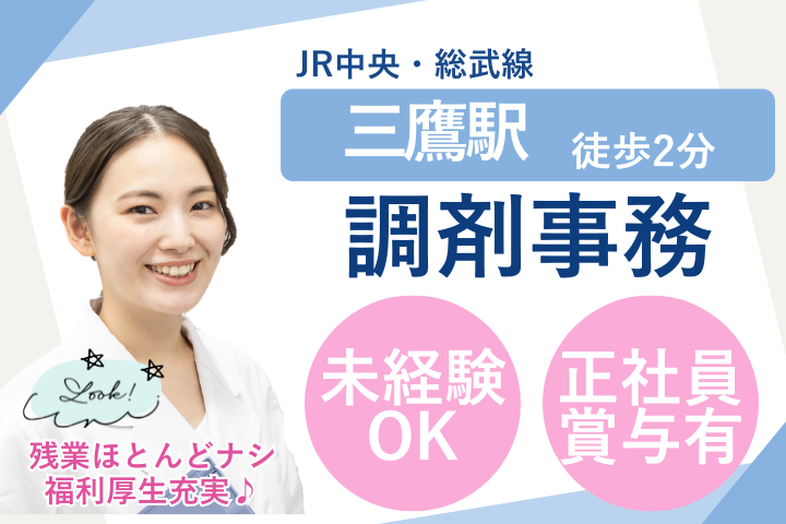 未経験から始める調剤事務*三鷹駅2分&週休2日*女性活躍中☆働きやすさも安定も叶えられる!