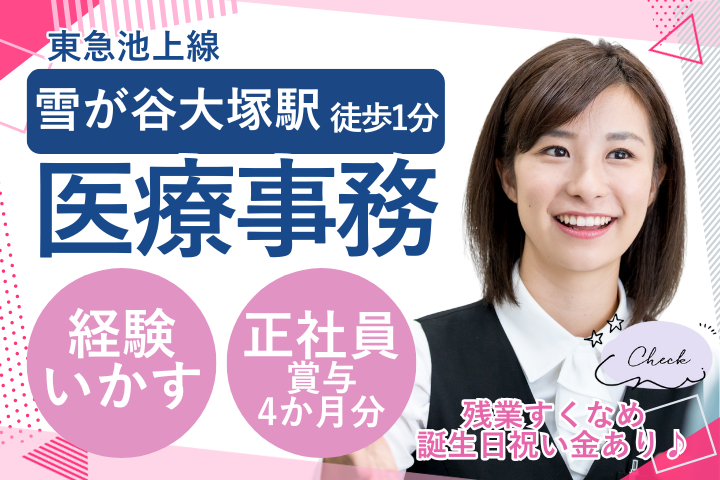 【雪が谷大塚駅1分】医療事務経験者歓迎*月給25万円+賞与4ヶ月/福利厚生充実の正社員募集