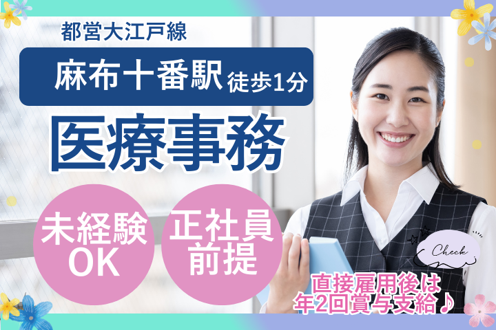 【麻布十番駅徒歩1分】未経験・ブランクOK!クリニック医療事務★年間休日120日&残業少なめ