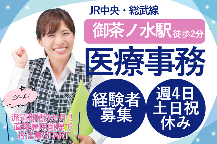 【御茶ノ水駅徒歩2分】週4日×土日祝休み*医療事務経験を活かせるクリニック♪