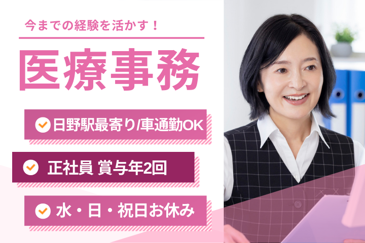 【日野駅】経験活かして活躍*賞与・昇給あり◎安定の正社員医療事務|日祝休&残業少なめ