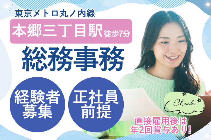 【本郷三丁目駅7分】土日祝休み×年間休日120日*経験を活かしてキャリアUP!学校法人の総務事務スタッフ募集