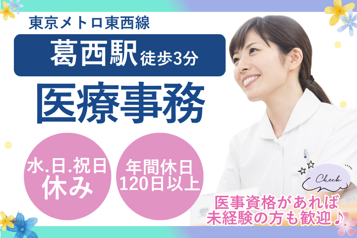 【葛西駅徒歩3分】時給1600円~&交通費全額支給*未経験スタート歓迎!葛西駅近クリニック医療事務
