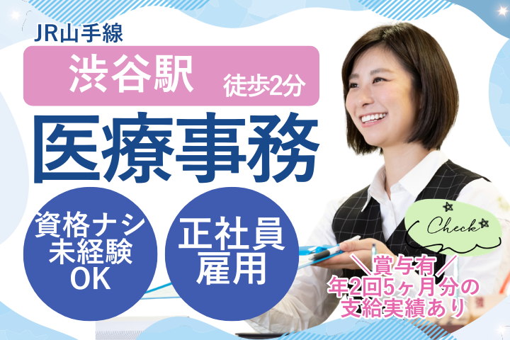 【渋谷駅徒歩2分】未経験から始める医療事務*新規オープンで同期とスタート!賞与5ヶ月分&充実福利厚生