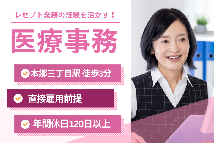 【本郷三丁目駅徒歩3分】高時給1,700円&福利厚生充実◎経験を活かせる医療事務*正社員登用あり