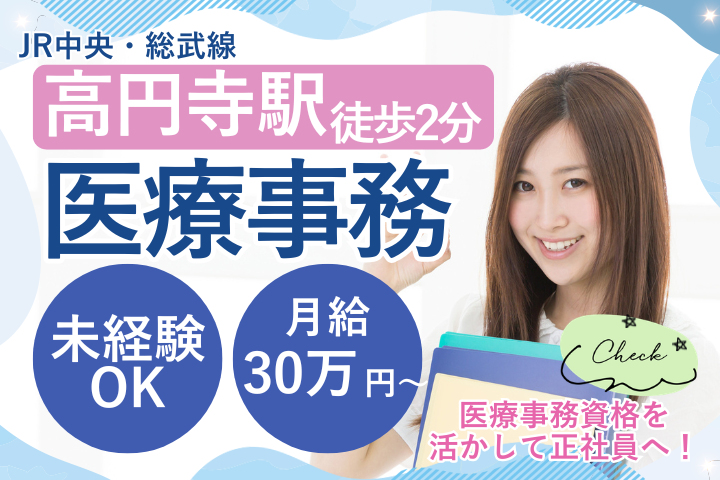 【高円寺駅徒歩2分】医療事務資格があれば未経験も歓迎*賞与&昇給あり・年収450万~|週休2日&残業少なめ♪