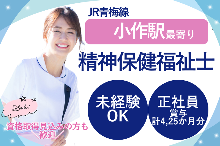 【小作駅最寄り】未経験OK!賞与4ヶ月超/福利厚生充実で安心の精神保健福祉士・正社員募集