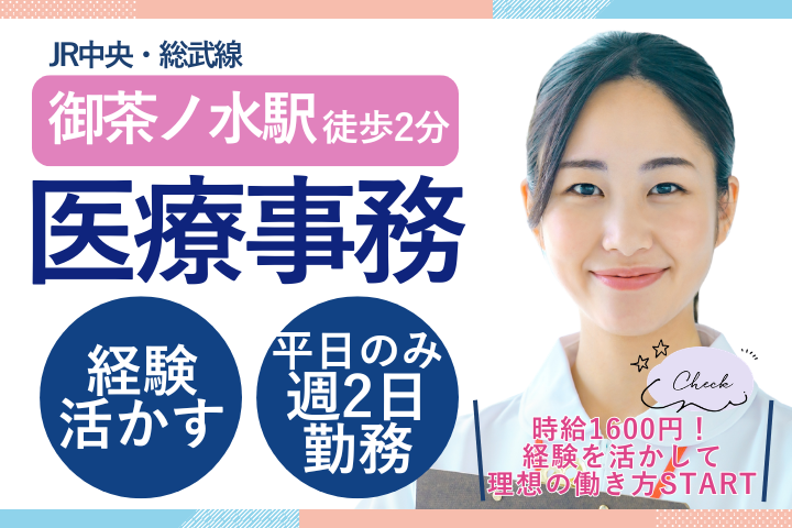 【御茶ノ水駅徒歩2分】医療事務経験1年以上でOK!土日祝休み◎医療事務パート募集♪
