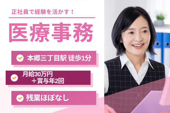 【本郷三丁目駅徒歩1分】月給30万円&賞与2回*医療事務経験者歓迎のクリニック受付スタッフ募集♪