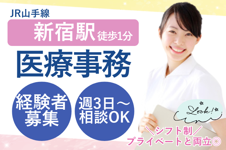 新宿駅チカ1分!週3日~OK☆医療事務経験を活かして無理なく働ける/交通費全額&研修充実