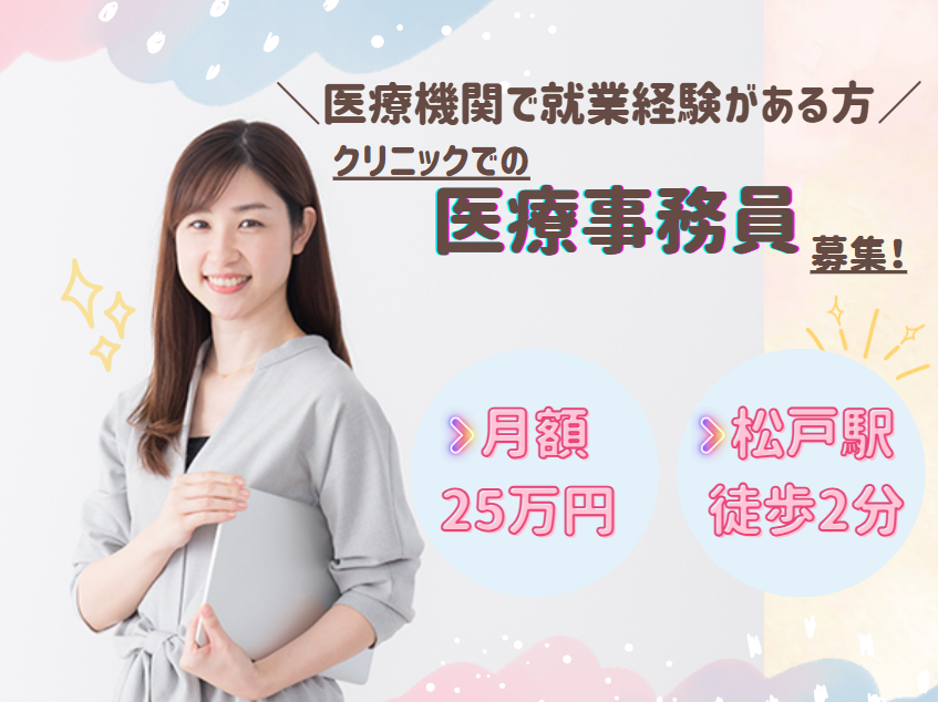 【松戸駅チカ・年休125日】正社員デビューのチャンス☆即戦力募集!皮膚科クリニックで経験を活かす医療事務◆賞与3ヵ月分あり