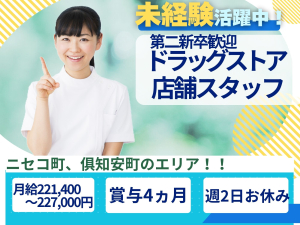 【ニセコ町、俱知安町エリア】無資格未経験OK!第二新卒の方もポテンシャルを評価!月給221,400円~227,000円/週2日お休みあり◎賞与4カ月,昇給あり!サツドラでの店舗スタッフ