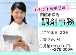 【函館市鍛治】経験必須!月給180,000円~275,000円/賞与3ヶ月分/年間休日120日/マイカー通勤可/無料駐車場完備/ファーマライズ薬局鍛冶店/調剤事務