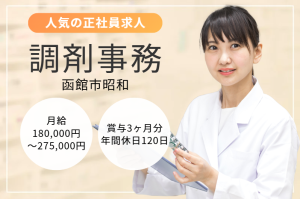 【函館市昭和】経験必須!月給180,000円~275,000円/賞与3ヶ月分/年間休日120日/マイカー通勤可/無料駐車場完備/ファーマライズ薬局昭和店/調剤事務