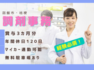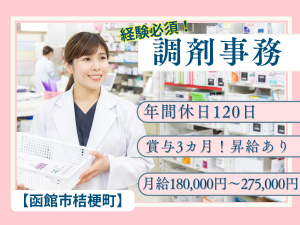 【函館市桔梗町】経験必須!月給180,000円~275,000円/賞与3ヶ月分/年間休日120日/マイカー通勤可/無料駐車場完備/トリム薬局 桔梗店/調剤事務