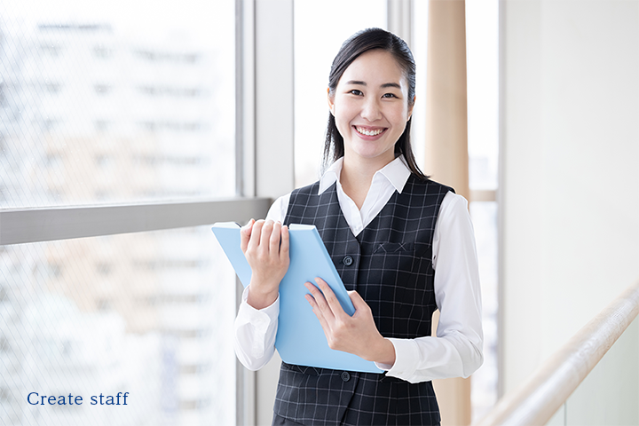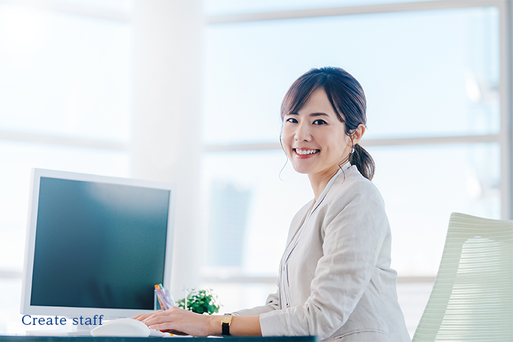A:クリエイトメンバーのみで働いている事で、「こんなこと聞いてもいいかな…?」といったような小さな疑問でも、わからないことがあれば気軽に相談できて、先輩方も優しく丁寧に教えてくれることです。職場の上司以外にも、まめに連絡をくれて親身になって話を聞いてくれる営業の方がいる事もありがたく思っています。職場でもどこでも、自分ひとりじゃない、支えてくれる誰かがいる安心感があるので、未経験からはじめた私も長く続けていけるんだと思います。