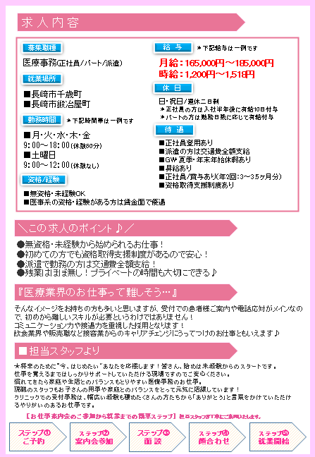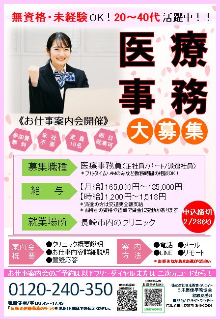 長崎市の複数のクリニックで、医療事務員を募集しております!
