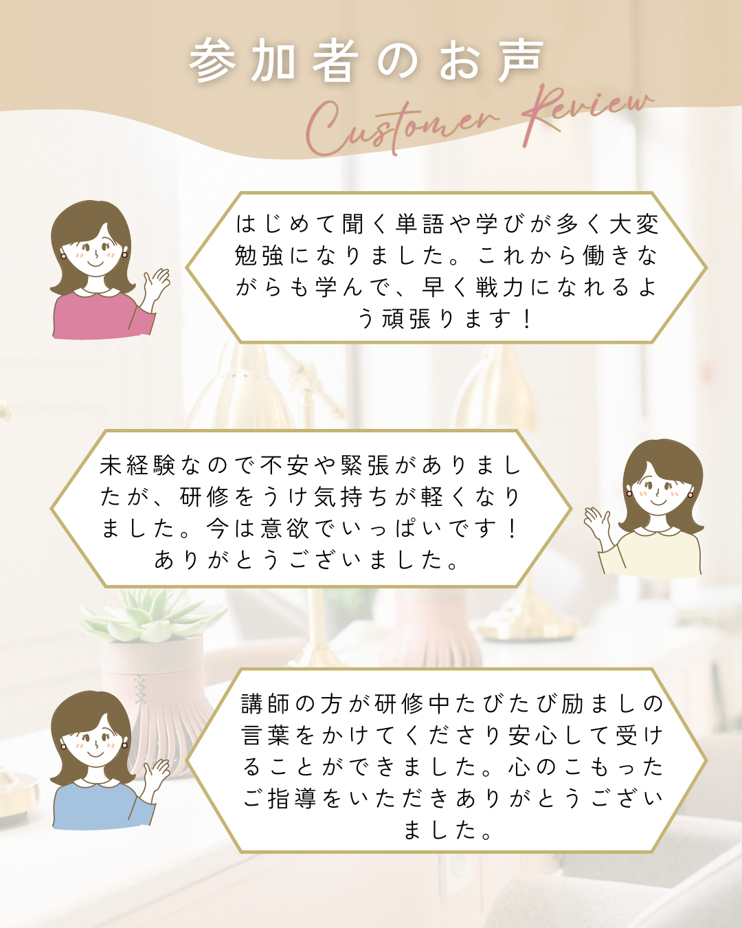 スムーズに業務を開始することができ、お仕事にも早く慣れることができます♪