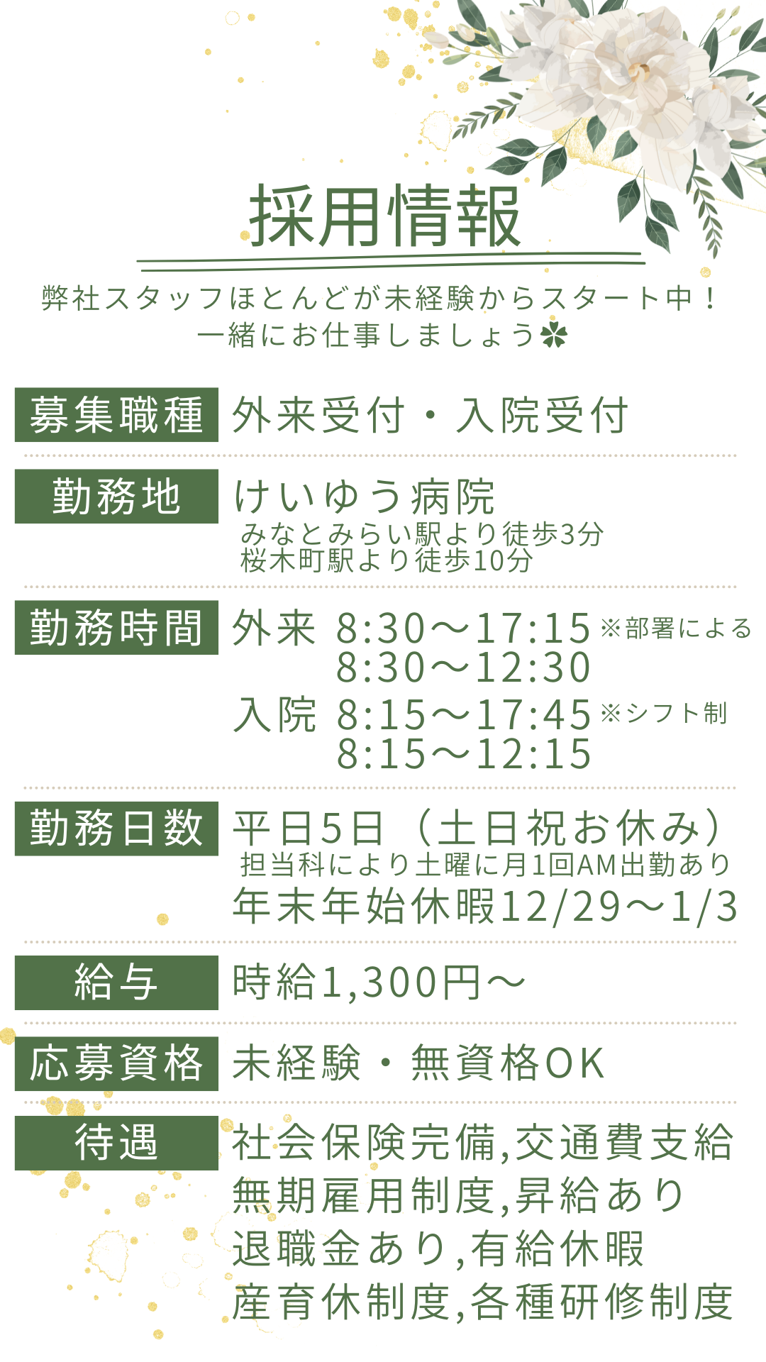 そんな方にこそ、弊社クリエイトを通じてけいゆう病院でのお仕事をオススメさせていただきます。