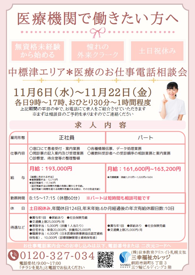 #北海道#中標津町#医療機関#キャリアアップ#お仕事説明会#相談会#正社員#20代#30代#40代#50代#無資格#医療事務#外来クラーク#求人#仕事#社会奉仕#就職活動#転職活動#ブランクあり歓迎#人間関係#働きがいのある仕事#人や社会の役に立てる#今後ニーズの高まる仕事#仕事#求人#体験#見学#無料#服装自由#ハローワーク#三幸#三幸福祉カレッジ