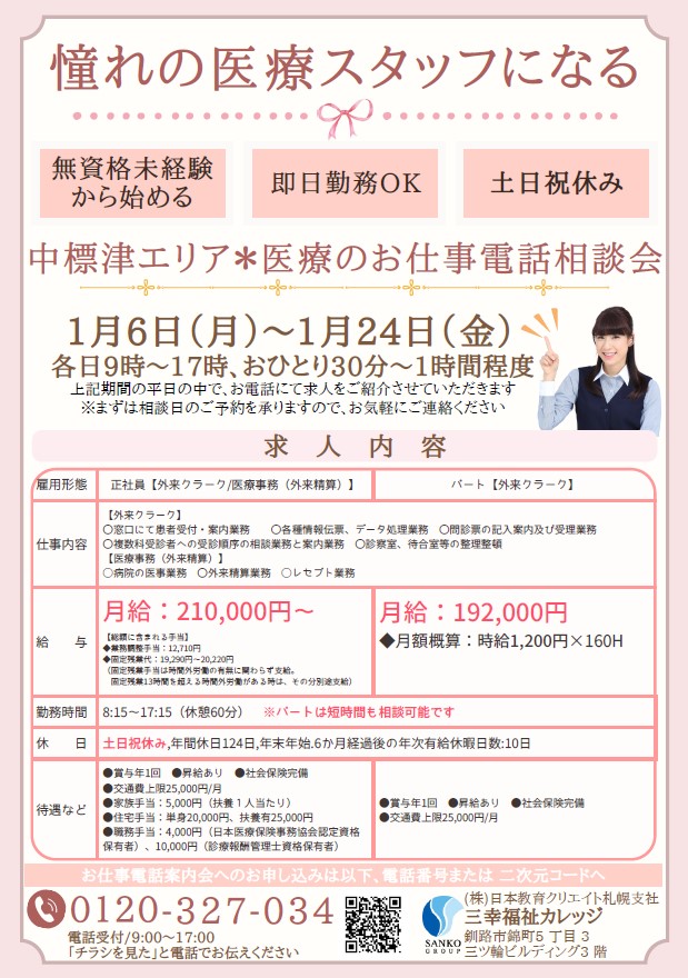 #北海道#中標津町#医療機関#キャリアアップ#お仕事説明会#相談会#正社員#20代#30代#40代#50代#無資格#医療事務#外来クラーク#求人#仕事#社会奉仕#就職活動#転職活動#ブランクあり歓迎#人間関係#働きがいのある仕事#人や社会の役に立てる#今後ニーズの高まる仕事#仕事#求人#体験#見学#無料#服装自由#ハローワーク#三幸#三幸福祉カレッジ