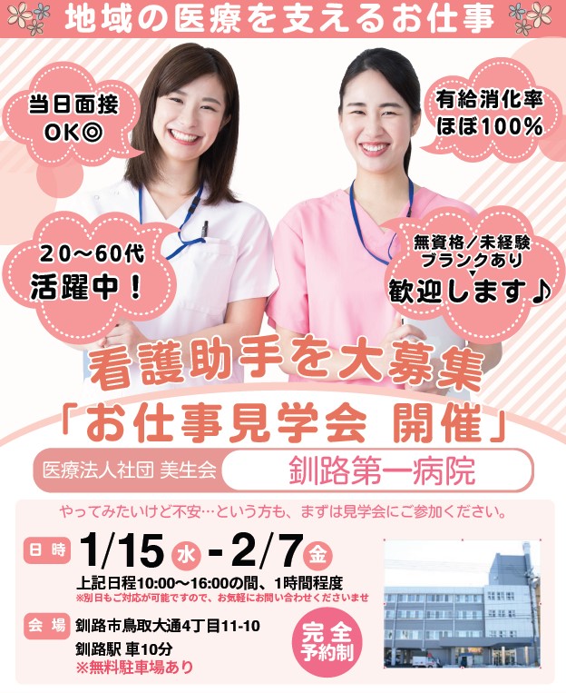 【釧路市】釧路第一病院|個別見学会開催|正社員|契約社員|介護福祉士|無資格|看護助手大募集