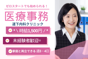 【道下内科クリニック】未経験から始められるクリニックの医療事務!時給1,500円~スタート!17時まで&賞与2ヶ月分♪
