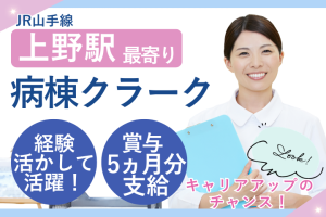 【上野駅徒歩7分】医療事務経験3年以上×正社員/賞与5ヶ月&年休120日で長く働ける病棟クラーク