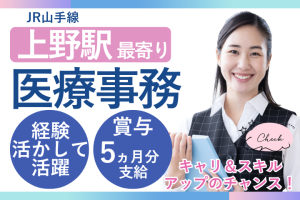 【上野駅徒歩7分】医療事務経験3年以上歓迎*賞与5ヶ月&年休120日で働きやすい環境