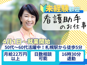 【札幌駅から徒歩5分】4月1日就業開始!月収22万以上◎時給1,250円/日勤のみ/16時半退勤/日数相談可能/斗南病院/看護助手