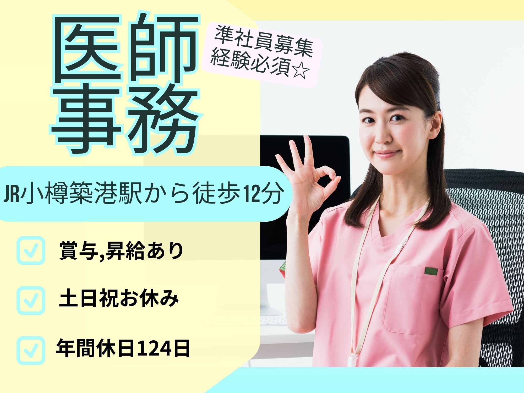 【JR小樽築港駅から徒歩12分】医師事務経験必須!月給175,500円~181,900円/土日祝休み◎年間休日124日/福利厚生充実!医師事務作業補助者/北海道済生会小樽病院(準社員)